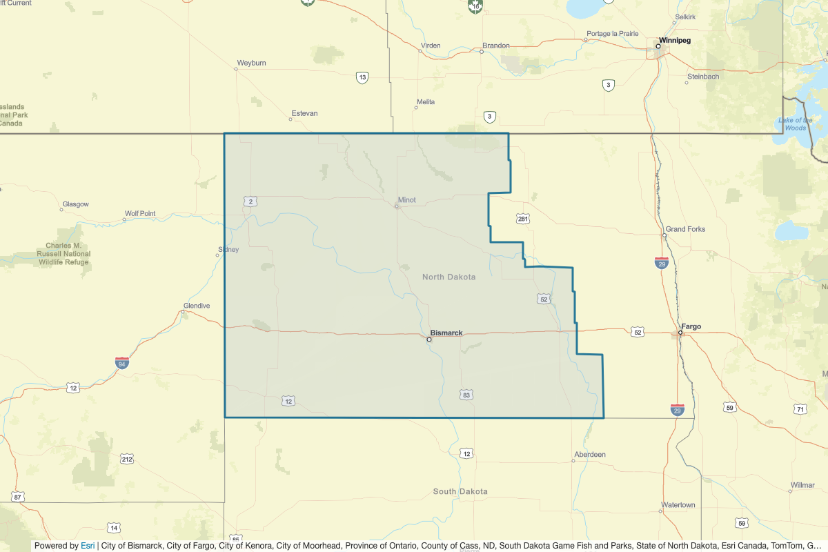This includes Fallon, Richland, Sheridan, Wibaux, Roosevelt, Harding, Corson, Campbell, Brown, Divide, Eddy, Emmons, Foster, Golden Valley, Grant, Griggs, Hettinger, Kidder, LaMoure, Logan, McHenry, McIntosh, McLean, Mercer, Mountrail, Oliver, Pierce, Ransom, Renville, Rolette, Sargent, Sheridan, Slope, Stark, Stutsman, Towner, Williams, Adams, Barnes, Benson, Billings, Bottineau, Bowman, Burke, Burleigh, Dickey, Ward, Wells, Morton, Perkins, McPherson, McKenzie, Dunn, and Sioux