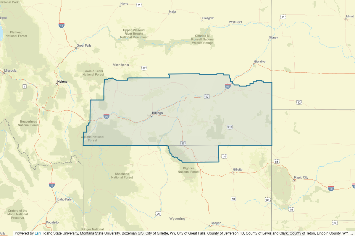 This includes Carter, Custer, Fallon, Fergus, Garfield, Judith Basin, Meagher, Musselshell, Petroleum, Powder River, Prairie, Treasure, Wibaux, Yellowstone, Sweet Grass, Stillwater, Park, Gallatin, Golden Valley, Wheatland, Carbon, Big Horn, Rosebud, Park, Johnson, Big Horn, Crook, Campbell, Sheridan, Harding, Butte, Golden Valley, Slope, and Bowman