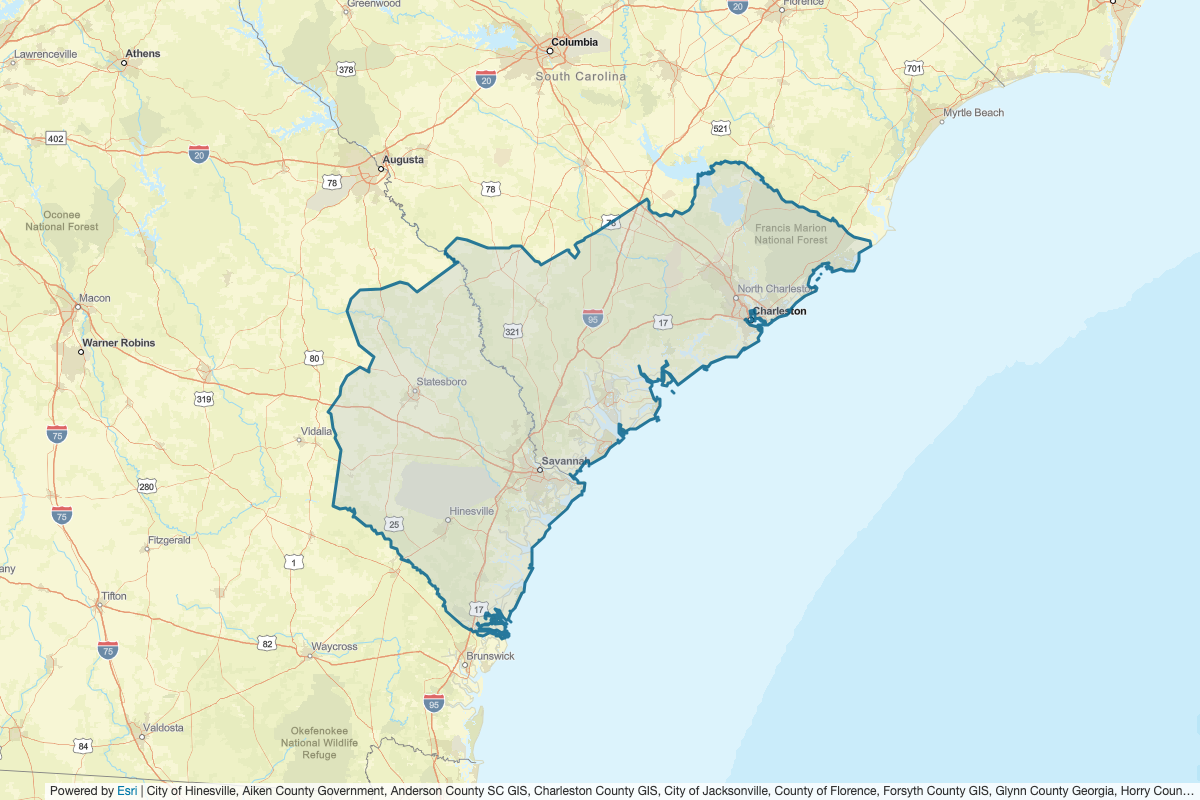 This includes Wayne, Toombs, Tattnall, Screven, Emanuel, Jenkins, Evans, Appling, Bulloch, Burke, Candler, Allendale, Bamberg, Clarendon, Dorchester, Effingham, Orangeburg, Williamsburg, Hampton, Charleston, Liberty, Berkeley, Bryan, Colleton, Chatham, Long, Glynn, McIntosh, Barnwell, Jasper, Georgetown, and Beaufort