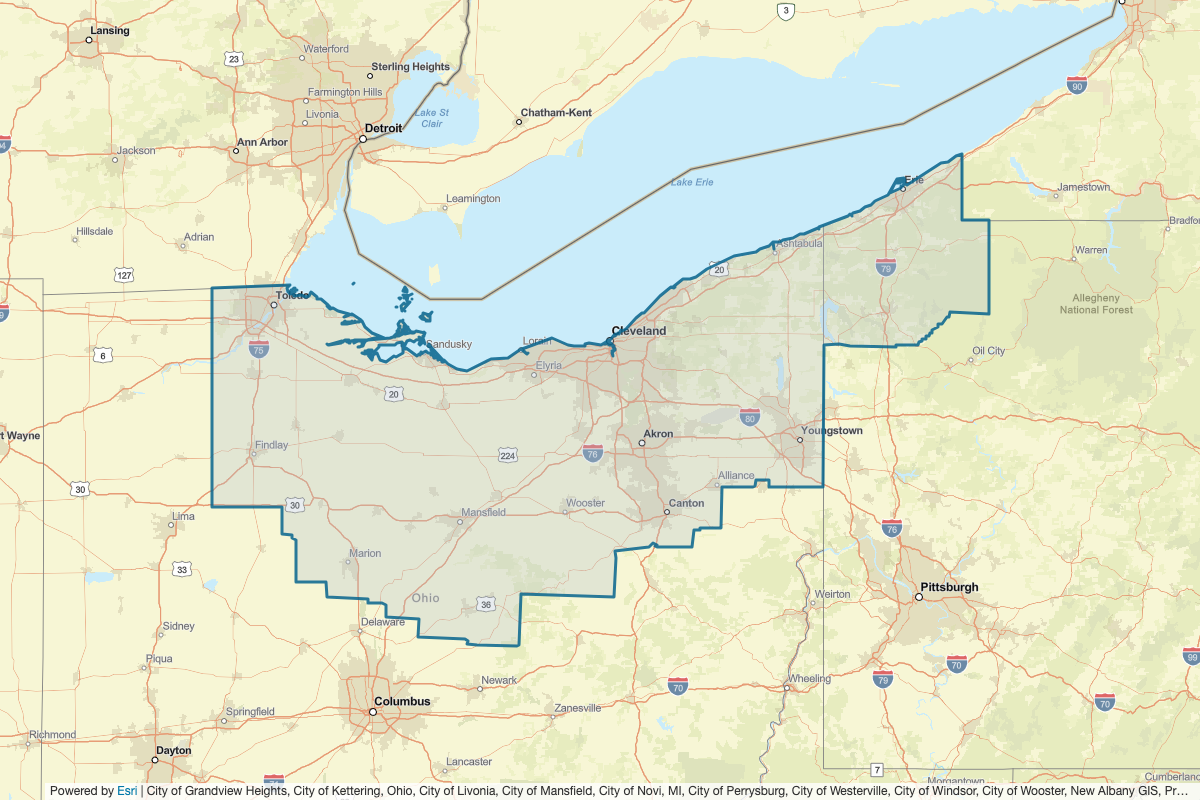 This includes Crawford, Lawrence, Mercer, Venango, Warren, Erie, Chautauqua, Carroll, Columbiana, Mahoning, Portage, Stark, Summit, Trumbull, Geauga, Lake, Ashtabula, Cuyahoga, Coshocton, Delaware, Holmes, Licking, Tuscarawas, Union, Lenawee, Allen, Ashland, Wyandot, Crawford, Fulton, Hancock, Hardin, Henry, Huron, Knox, Lorain, Marion, Medina, Morrow, Putnam, Richland, Seneca, Wayne, Wood, Lucas, Ottawa, Sandusky, Erie, and Monroe