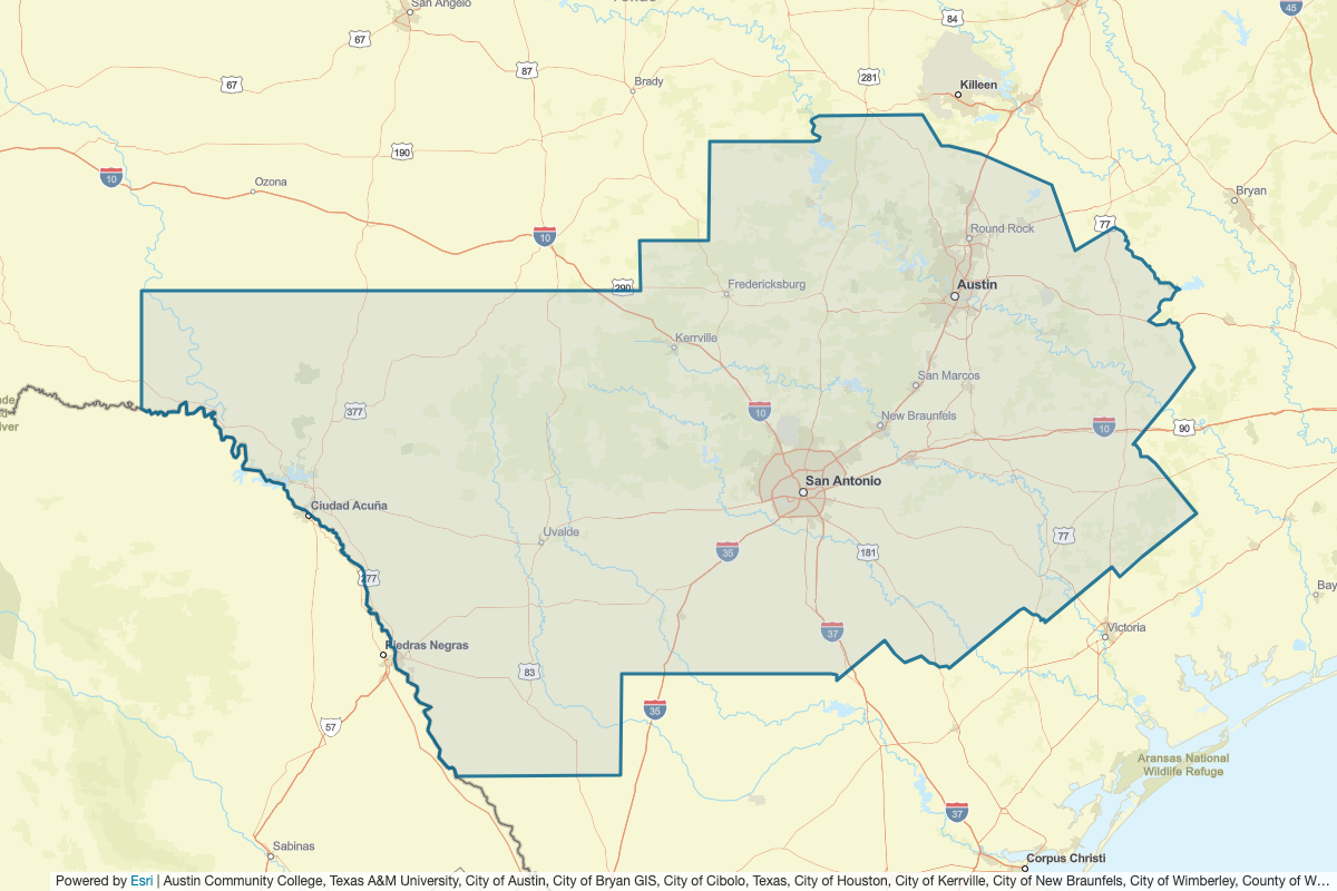 This includes Dimmit, La Salle, McMullen, Webb, Bee, Crockett, DeWitt, Edwards, Fayette, Gillespie, Gonzales, Guadalupe, Hays, Kendall, Kerr, Kimble, Kinney, Lampasas, Lavaca, Lee, Llano, Mason, Medina, Milam, Real, San Saba, Sutton, Terrell, Travis, Uvalde, Val Verde, Washington, Williamson, Wilson, Caldwell, Burnet, Burleson, Blanco, Bexar, Bell, Bastrop, Bandera, Austin, Colorado, Comal, Frio, Goliad, Karnes, Live Oak, Maverick, Zavala, Atascosa, Victoria, and Jackson