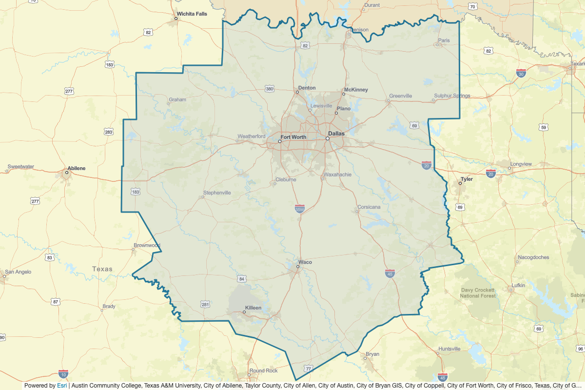 This includes Bryan, Choctaw, Jefferson, Love, Marshall, Delta, Denton, Fannin, Franklin, Grayson, Hopkins, Hunt, Jack, Lamar, Montague, Red River, Throckmorton, Wise, Young, Collin, Clay, Archer, Cooke, Dallas, Eastland, Ellis, Erath, Falls, Freestone, Hamilton, Henderson, Hill, Hood, Houston, Johnson, Kaufman, Lampasas, Lee, Leon, Limestone, McLennan, Madison, Milam, Mills, Navarro, Palo Pinto, Rains, Robertson, Rockwall, San Saba, Shackelford, Smith, Somervell, Stephens, Tarrant, Van Zandt, Williamson, Wood, Cherokee, Callahan, Burnet, Burleson, Brown, Brazos, Bosque, Bell, Anderson, Comanche, Coryell, and Parker