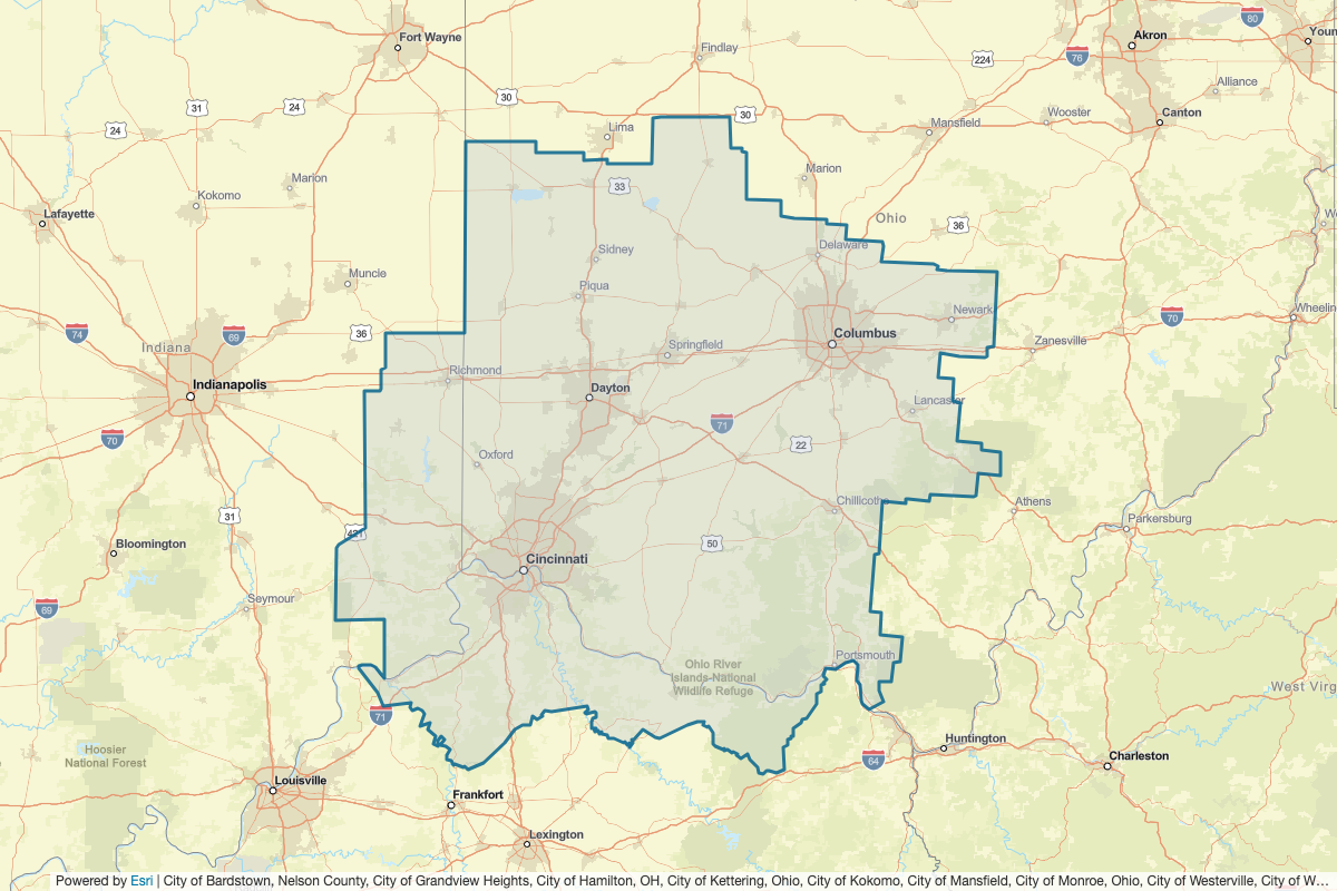 This includes Union, Rush, Randolph, Allen, Auglaize, Butler, Champaign, Clark, Wyandot, Clinton, Darke, Fayette, Franklin, Greene, Hamilton, Hancock, Hardin, Knox, Logan, Madison, Marion, Mercer, Miami, Montgomery, Morrow, Muskingum, Perry, Pickaway, Preble, Shelby, Van Wert, Vinton, Warren, Highland, Jay, Henry, Franklin, Adams, Decatur, Fayette, Wayne, Rowan, Carter, Greenup, Adams, Athens, Coshocton, Delaware, Fairfield, Hocking, Jackson, Lawrence, Licking, Pike, Ross, Scioto, Union, Lewis, Mason, Nicholas, Owen, Pendleton, Robertson, Scott, Trimble, Boone, Bracken, Campbell, Carroll, Fleming, Franklin, Gallatin, Grant, Harrison, Henry, Switzerland, Ohio, Brown, Clermont, Jennings, Jefferson, Dearborn, Ripley, and Kenton
