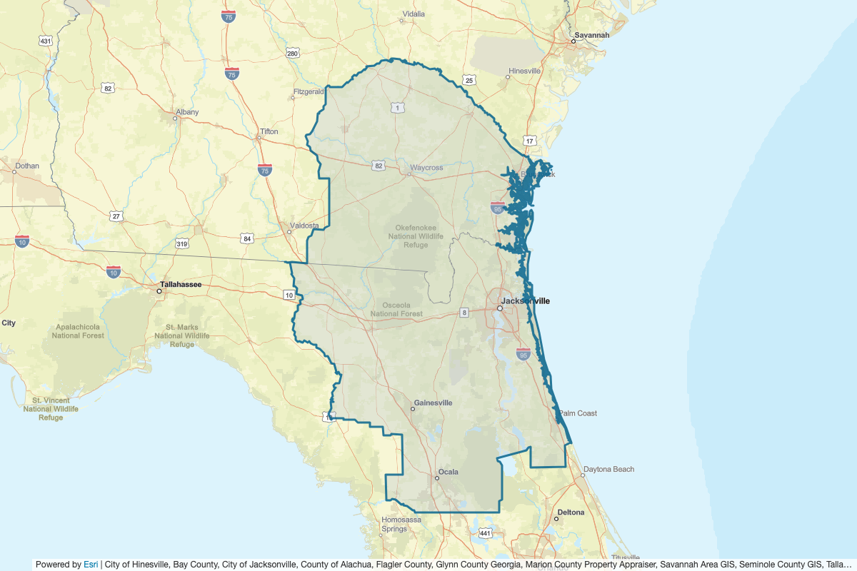 This includes Wheeler, Wayne, Ware, Toombs, Telfair, Tattnall, Pierce, Echols, Irwin, Montgomery, Lowndes, Lanier, Jeff Davis, Appling, Atkinson, Bacon, Ben Hill, Berrien, Brantley, Clinch, Coffee, Charlton, Camden, Long, Glynn, McIntosh, Clay, Bradford, Baker, Alachua, Putnam, Columbia, St. Johns, Gilchrist, Hamilton, Lafayette, Suwannee, Union, Madison, Marion, Flagler, Duval, Nassau, Sumter, Lake, Volusia, Dixie, Levy, and Citrus