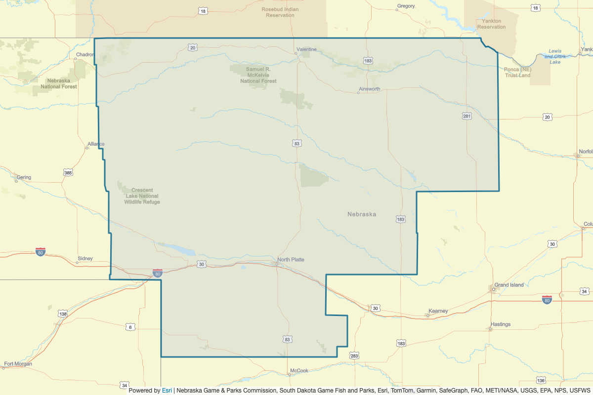 This includes Gregory, Charles Mix, Bennett, Dundy, Frontier, Furnas, Garfield, Gosper, Grant, Greeley, Hayes, Hitchcock, Holt, Hooker, Keith, Keya Paha, Knox, Blaine, Boone, Boyd, Brown, Buffalo, Chase, Custer, Dawson, Lincoln, Logan, Loup, McPherson, Perkins, Red Willow, Rock, Sherman, Thomas, Valley, Wheeler, Arthur, Antelope, Tripp, Todd, Cherry, Phillips, Sedgwick, Yuma, Deuel, Garden, Box Butte, Cheyenne, Dawes, Morrill, Sheridan, and Oglala Lakota