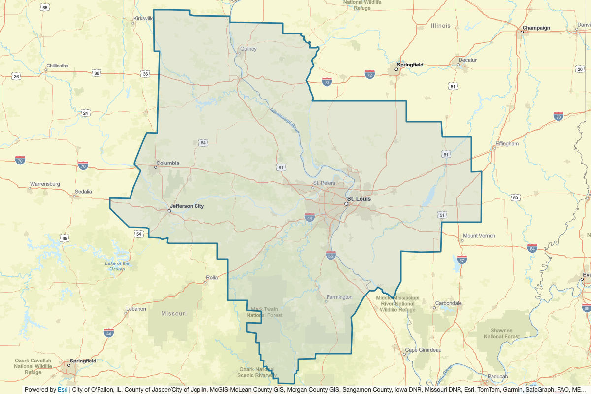 This includes Jackson, Jefferson, Jersey, Madison, Marion, Bond, Clay, Clinton, Monroe, Perry, Fayette, Randolph, St. Clair, Washington, Wayne, Bollinger, Boone, Callaway, Carter, Cole, Cooper, Crawford, Dent, Franklin, Gasconade, Iron, Jefferson, Lincoln, Madison, Maries, Miller, Moniteau, Montgomery, Morgan, Osage, Perry, Phelps, Reynolds, St. Charles, Ste. Genevieve, St. Francois, St. Louis, Shannon, Warren, Washington, Wayne, St. Louis City, Macoupin, Adams, Brown, Calhoun, Cass, Christian, Effingham, Greene, Montgomery, Morgan, Pike, Sangamon, Schuyler, Scott, Shelby, Hancock, Clark, Howard, Knox, Lewis, Macon, Marion, Monroe, Pike, Ralls, Randolph, Scotland, Shelby, Adair, and Audrain