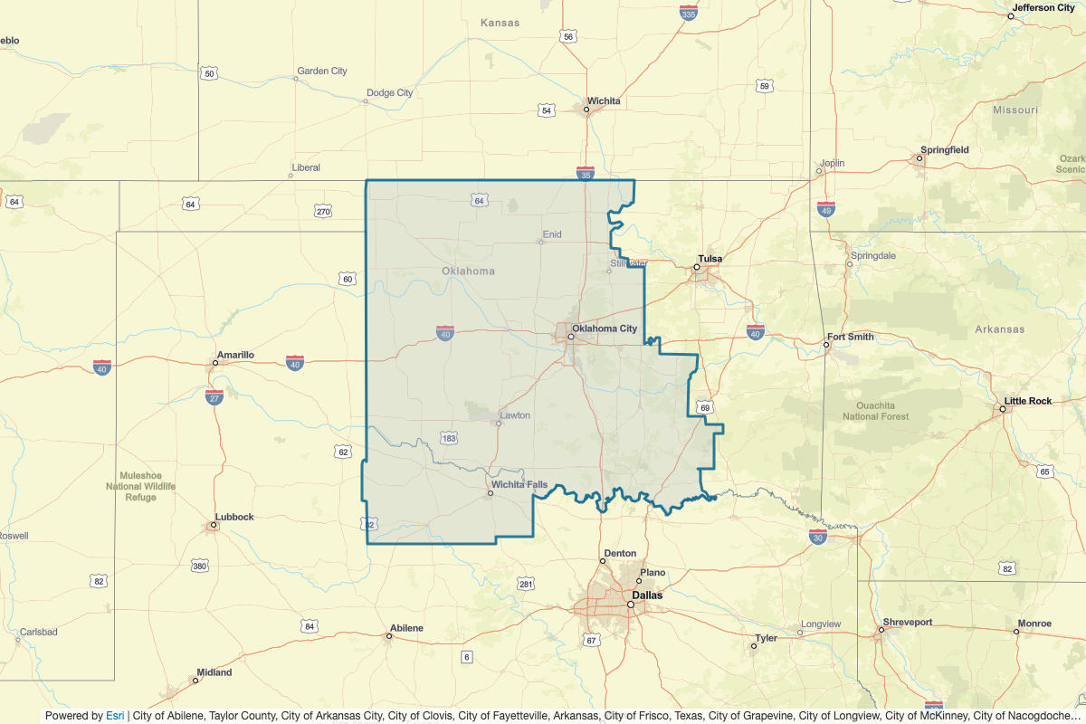 This includes Sumner, Harper, Barber, Clark, Comanche, Cowley, Garfield, Grant, Harper, Kay, Woodward, Major, Noble, Osage, Woods, Alfalfa, Beaver, Lipscomb, Blaine, Bryan, Caddo, Canadian, Carter, Choctaw, Cleveland, Coal, Comanche, Cotton, Creek, Custer, Dewey, Ellis, Garvin, Grady, Greer, Harmon, Hughes, Jackson, Jefferson, Johnston, Kingfisher, Kiowa, Lincoln, Logan, Love, McClain, McIntosh, Marshall, Murray, Okfuskee, Oklahoma, Pawnee, Payne, Pittsburg, Pontotoc, Pottawatomie, Pushmataha, Roger Mills, Seminole, Stephens, Tillman, Washita, Atoka, Beckham, Fannin, Foard, Grayson, Hardeman, Haskell, Hemphill, Jack, King, Knox, Lamar, Montague, Throckmorton, Wheeler, Wichita, Wilbarger, Young, Collingsworth, Clay, Childress, Baylor, Archer, Cooke, and Cottle