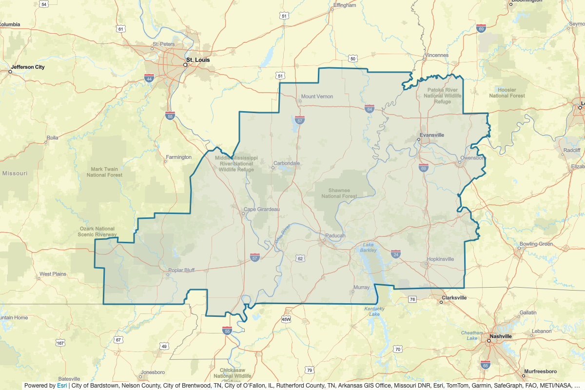 This includes Muhlenberg, Ohio, Todd, Butler, Daviess, Hancock, Spencer, Pike, Perry, Robertson, Knox, Daviess, Dubois, Warrick, Logan, McLean, Montgomery, Weakley, Henry, Lake, Obion, Clay, Pemiscot, Randolph, Marshall, Trigg, Union, Webster, Fulton, Ballard, Caldwell, Calloway, Carlisle, Christian, Hopkins, Crittenden, Graves, Hickman, Henderson, Jackson, Jefferson, Johnson, Lawrence, Marion, Massac, Vanderburgh, Posey, Stewart, Alexander, Clay, Edwards, Gibson, Livingston, Lyon, McCracken, Perry, Pope, Pulaski, Randolph, Richland, Saline, Union, Wabash, Washington, Wayne, White, Williamson, Franklin, Gallatin, Hardin, Hamilton, Bollinger, Butler, Cape Girardeau, Carter, Dunklin, Iron, Madison, Mississippi, New Madrid, Oregon, Perry, Reynolds, Ripley, Ste. Genevieve, St. Francois, Scott, Shannon, Stoddard, and Wayne