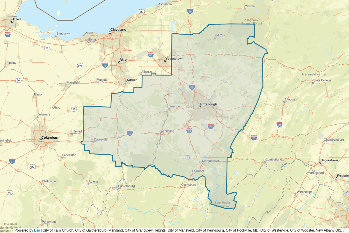 This includes Allegheny, Armstrong, Beaver, Butler, Cambria, Clarion, Clearfield, Crawford, Elk, Forest, Greene, Indiana, Jefferson, Lawrence, Mercer, Somerset, Venango, Warren, Washington, Ohio, Marshall, Hancock, Brooke, Fayette, Westmoreland, Belmont, Carroll, Columbiana, Jefferson, Mahoning, Monroe, Stark, Trumbull, Garrett, Preston, Monongalia, Marion, Randolph, Wetzel, Barbour, Taylor, Tyler, Tucker, Harrison, Doddridge, Grant, Coshocton, Guernsey, Harrison, Holmes, Licking, Morgan, Noble, Tuscarawas, Washington, Knox, Muskingum, and Perry