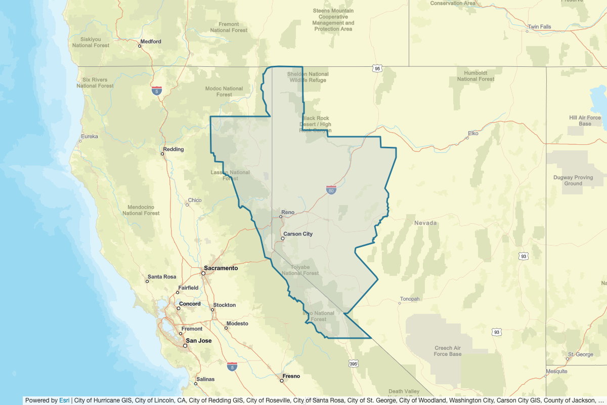This includes Churchill, Esmeralda, Mineral, Storey, Mono, Sierra, Fresno, Tuolumne, Madera, Nevada, Alpine, El Dorado, Placer, Inyo, Douglas, Lyon, Carson City, Nye, Humboldt, Pershing, Harney, Plumas, Lassen, Modoc, Shasta, Washoe, Lander, and Lake