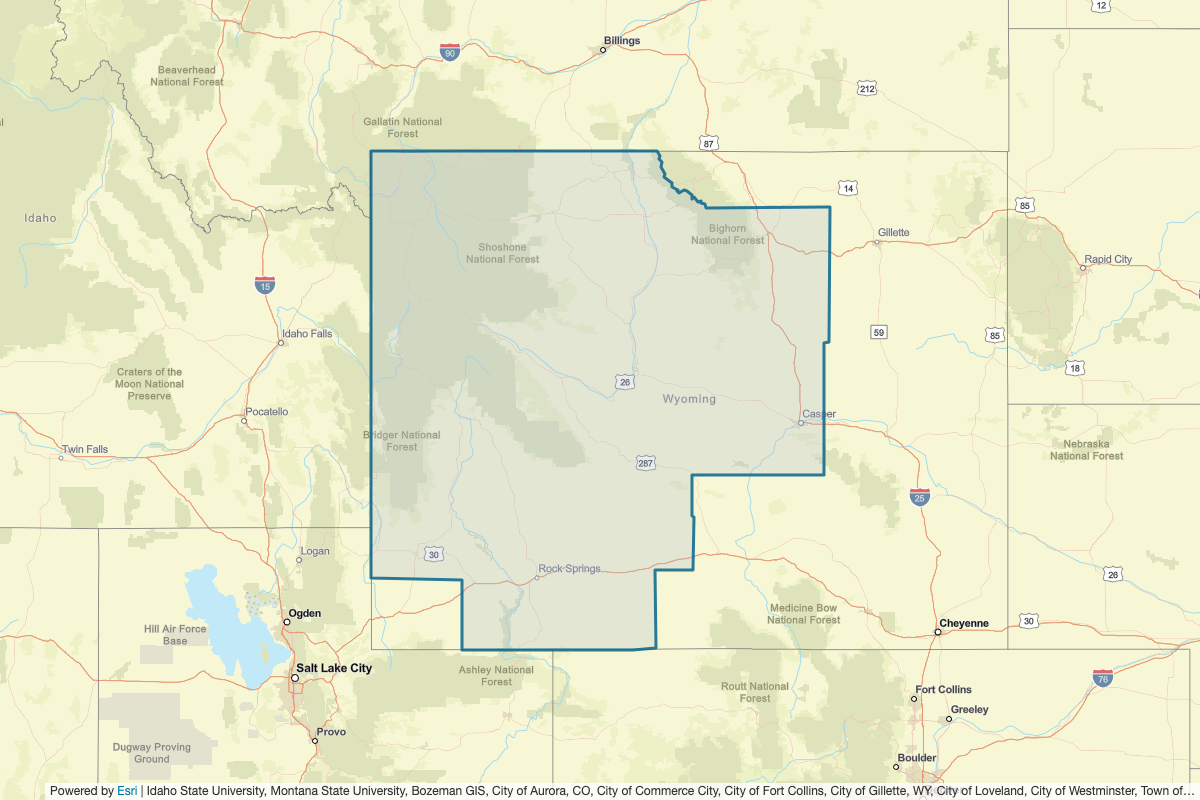 This includes Fremont, Park, Gallatin, Carbon, Big Horn, Teton, Park, Hot Springs, Washakie, Johnson, Big Horn, Campbell, Sheridan, Uinta, Moffat, Fremont, Sweetwater, Natrona, Lincoln, Sublette, Carbon, Converse, Bear Lake, Caribou, Teton, Summit, Rich, Bonneville, and Daggett
