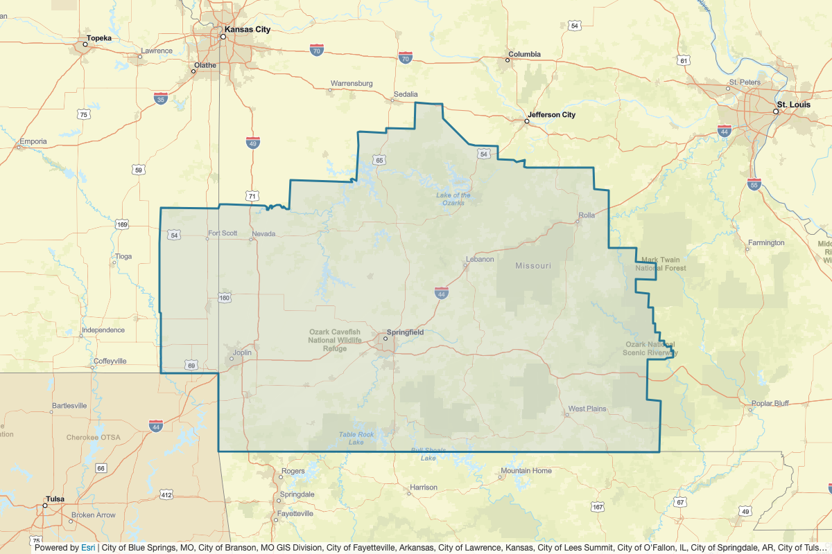 This includes Barton, Bates, Benton, Camden, Carter, Cedar, Christian, Cole, Cooper, Crawford, Dent, Douglas, Gasconade, Greene, Henry, Hickory, Howell, Iron, Laclede, Barry, McDonald, Maries, Miller, Moniteau, Morgan, Newton, Oregon, Osage, Ozark, Pettis, Phelps, Polk, Pulaski, Reynolds, Ripley, St. Clair, Shannon, Stone, Taney, Texas, Vernon, Webster, Wright, Dade, Dallas, Lawrence, Marion, Neosho, Linn, Labette, Allen, Bourbon, Cherokee, Crawford, Craig, Delaware, Ottawa, Jasper, Baxter, Benton, Carroll, Fulton, Randolph, Sharp, and Boone
