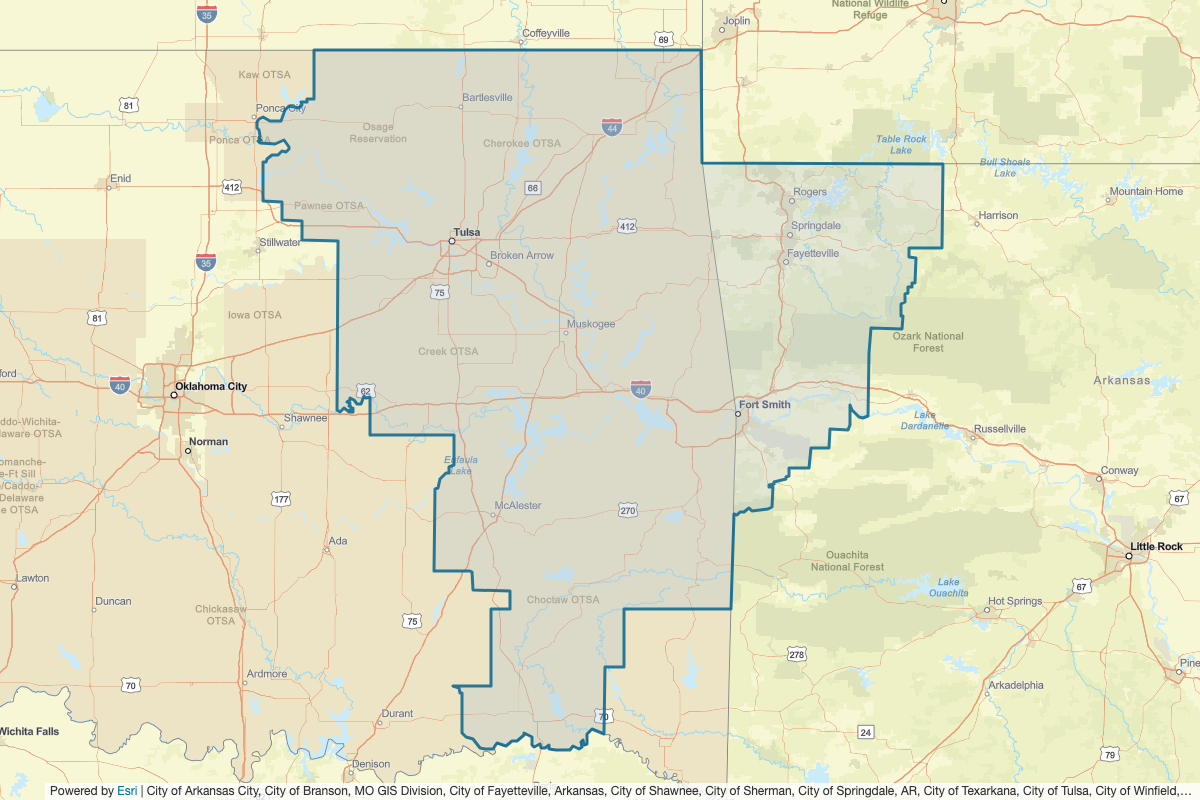 This includes Barry, McDonald, Newton, Stone, Taney, Montgomery, Labette, Chautauqua, Cherokee, Cowley, Craig, Delaware, Kay, Mayes, Noble, Nowata, Osage, Ottawa, Rogers, Washington, Benton, Carroll, Crawford, Franklin, Johnson, Logan, Madison, Newton, Polk, Scott, Sebastian, Washington, Boone, Bryan, Cherokee, Choctaw, Coal, Creek, Haskell, Hughes, Le Flore, Lincoln, McCurtain, McIntosh, Muskogee, Okfuskee, Okmulgee, Pawnee, Payne, Pittsburg, Pottawatomie, Pushmataha, Seminole, Sequoyah, Tulsa, Wagoner, Latimer, Adair, Atoka, Lamar, and Red River